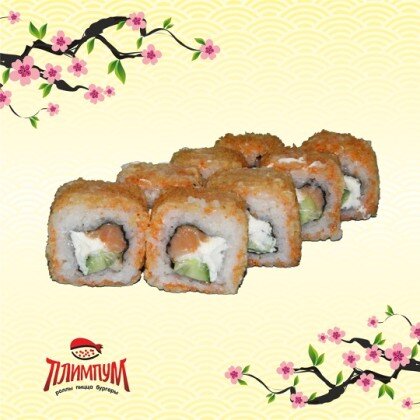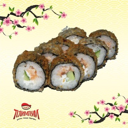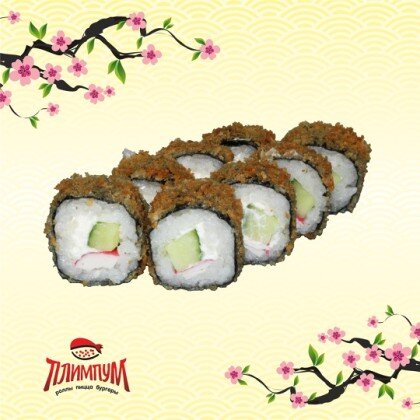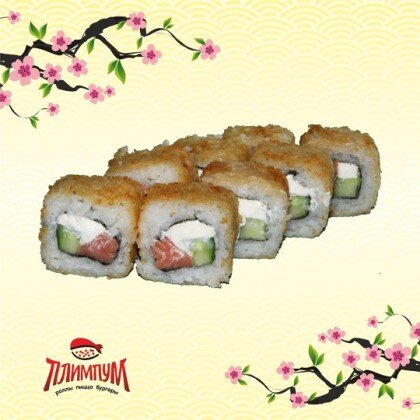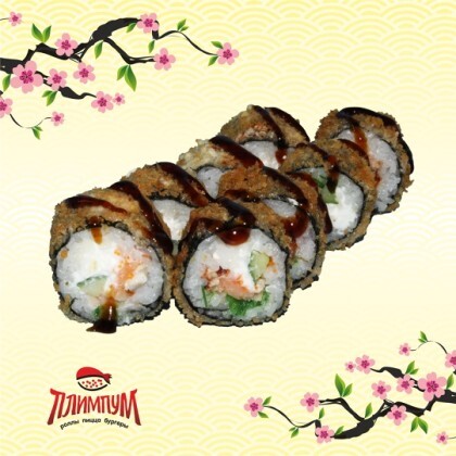 Рис, нори, креветка, лосось, сыр, огурец, масага, темпурный кляр.