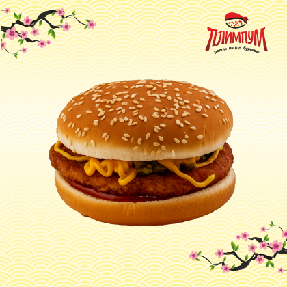 Булочка с кунжутом, 2Х котлета куриная, 2Х сыр «Чеддер», салат, томат, маринованный огурчик, лук, фирменный соус.