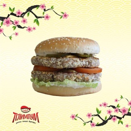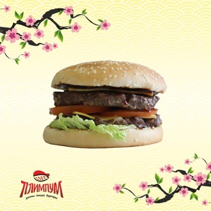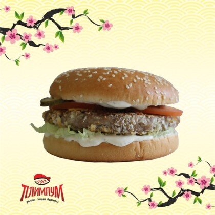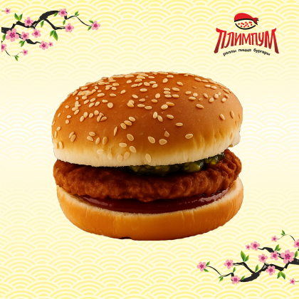 Булочка с кунжутом, кетчуп, котлета куриная, маринованные огурцы, Чеддер.